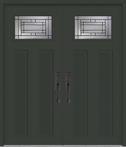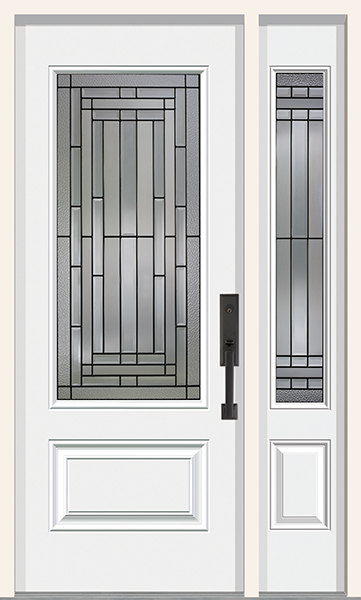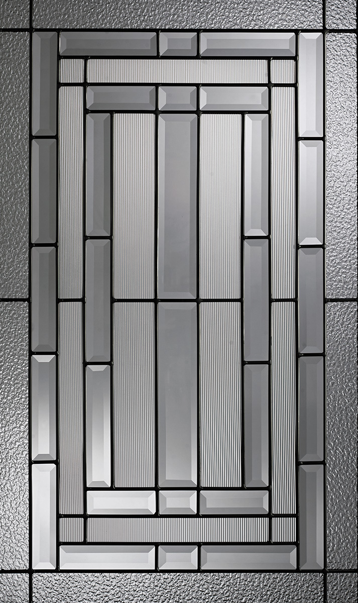 Luminating, lavishly finished granite glass edged with clear bevels highlights the symmetrical precision of the Wilshire collection’s contemporary design. Featuring crisp patina caming to accentuate its stylish corners, Wilshire’s modern splendor will add resonance to any entrance or hallway.