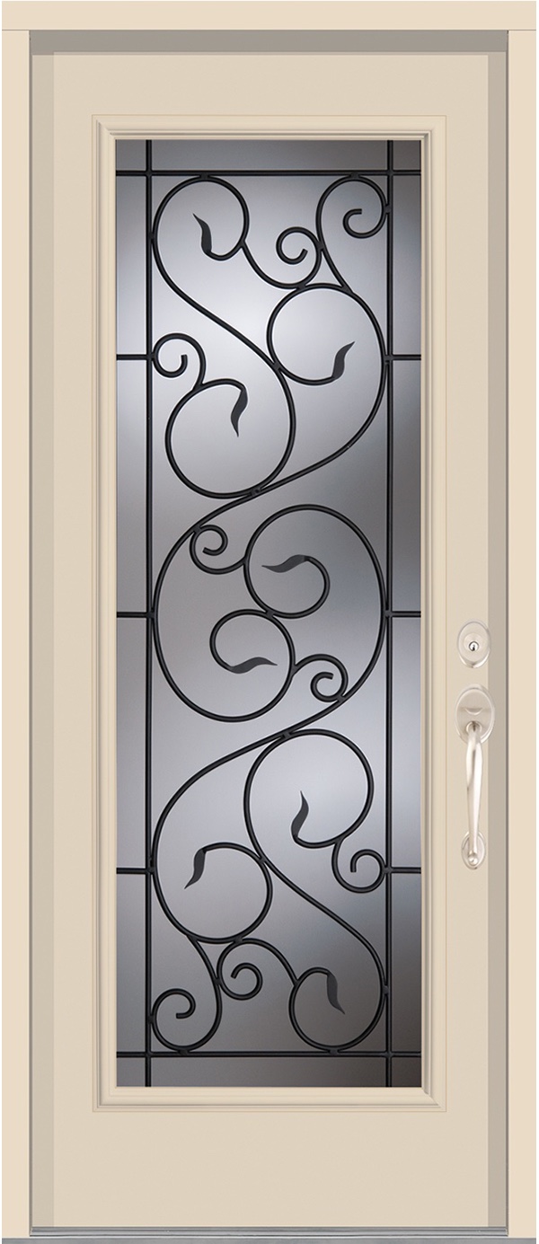 The delicate wrought iron twists romantically throughout the Alburn series. The lithe curls are reminiscent of nature, creating a stunning contrast with the old-world metal for an eloquent entrance door. Add a personal touch by using one of our many custom glass options.